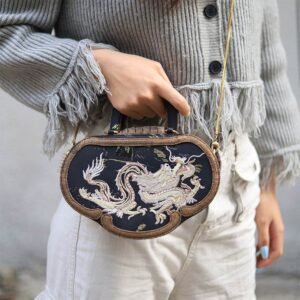 Embroidery Leather Tote Bag Bamboo Handle Auspicious Cloud
