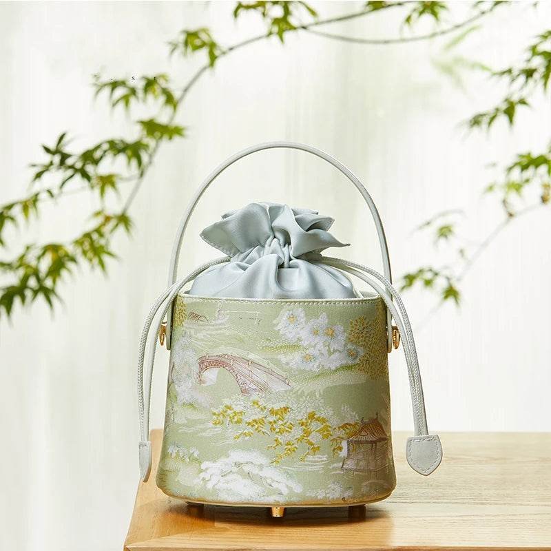 Be the first to review “Chinese Painting Mulberry Silk Green Bucket Designer Handbag”