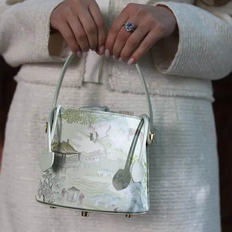 Chinese Painting Mulberry Silk Green Bucket Designer Handbag