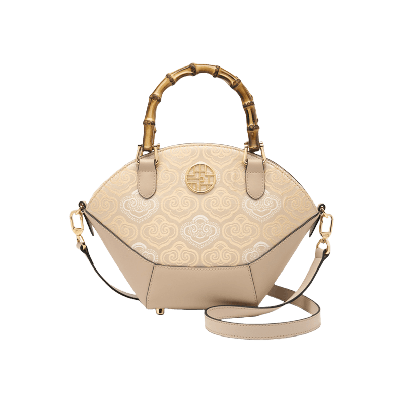 Embroidery Leather Tote Bag Bamboo Handle Auspicious Cloud