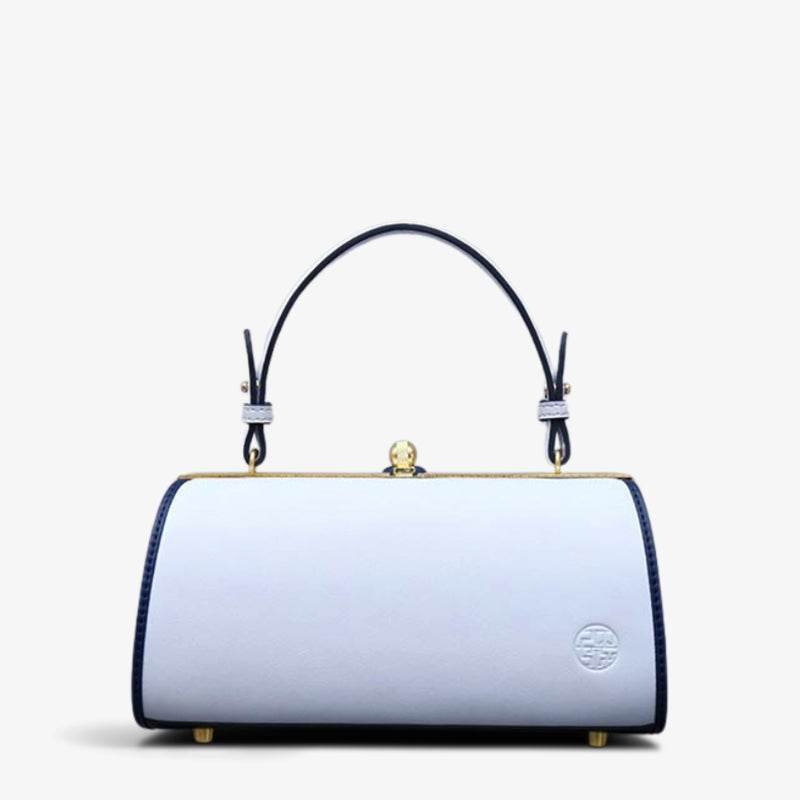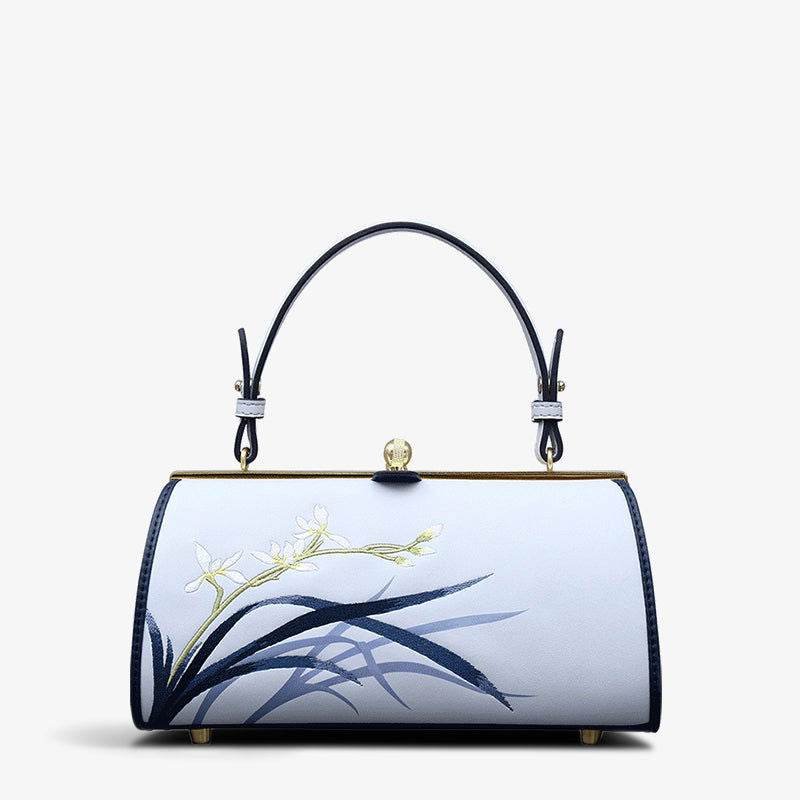 Embroidery Leather Blue Kiss Lock Bag Orchid Cylinder Chain Handbag