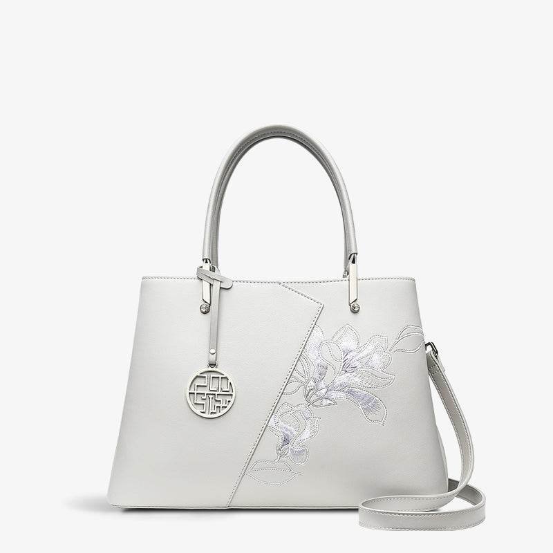 Embroidery Leather Magnolia Tote Bag Elegant Women Handbag with Scarf