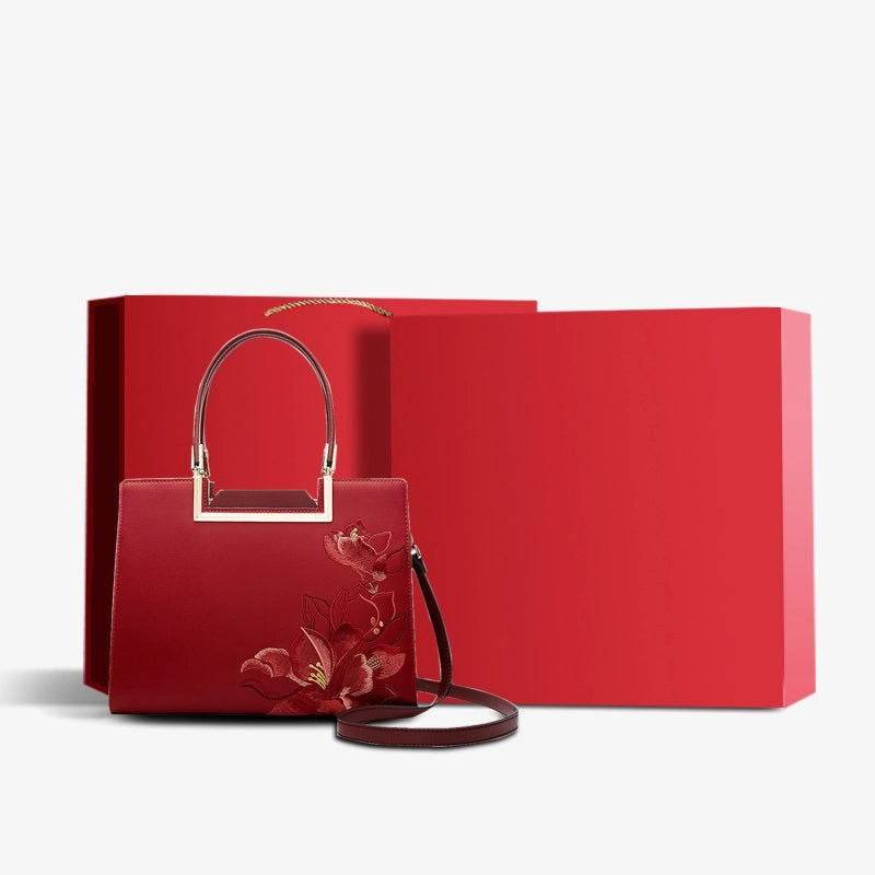Sinocultural Embroidery Leather Red Tote Bag Magnolia Women’s Handbag