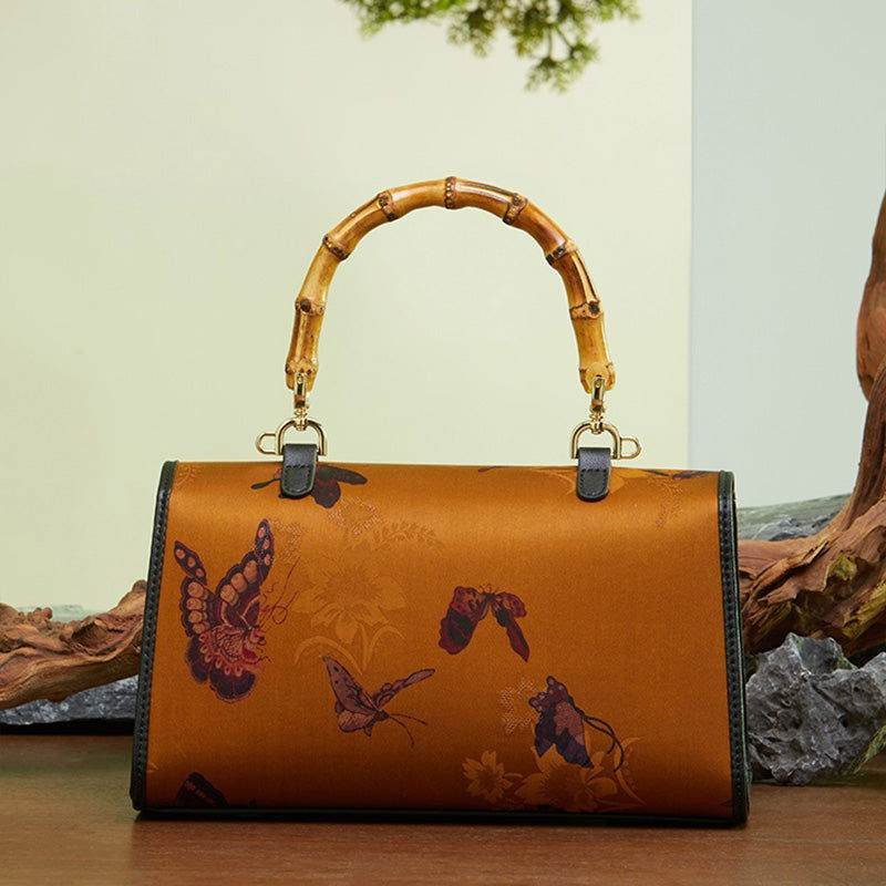 Xiangyunsha Silk Brown Butterfly Bamboo Handle Handbag