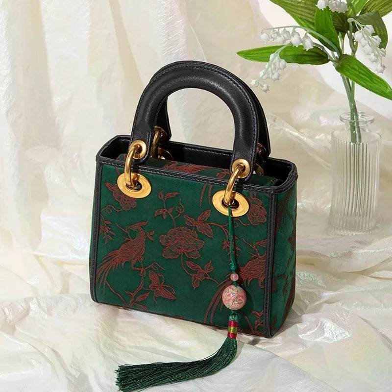 Xiangyunsha Silk Green Retro Cowhide Handbag with Pendant