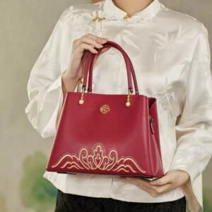 Zhuang Brocade Flying Swallow Motif Embroidered Leather Bucket Crossbody Bag