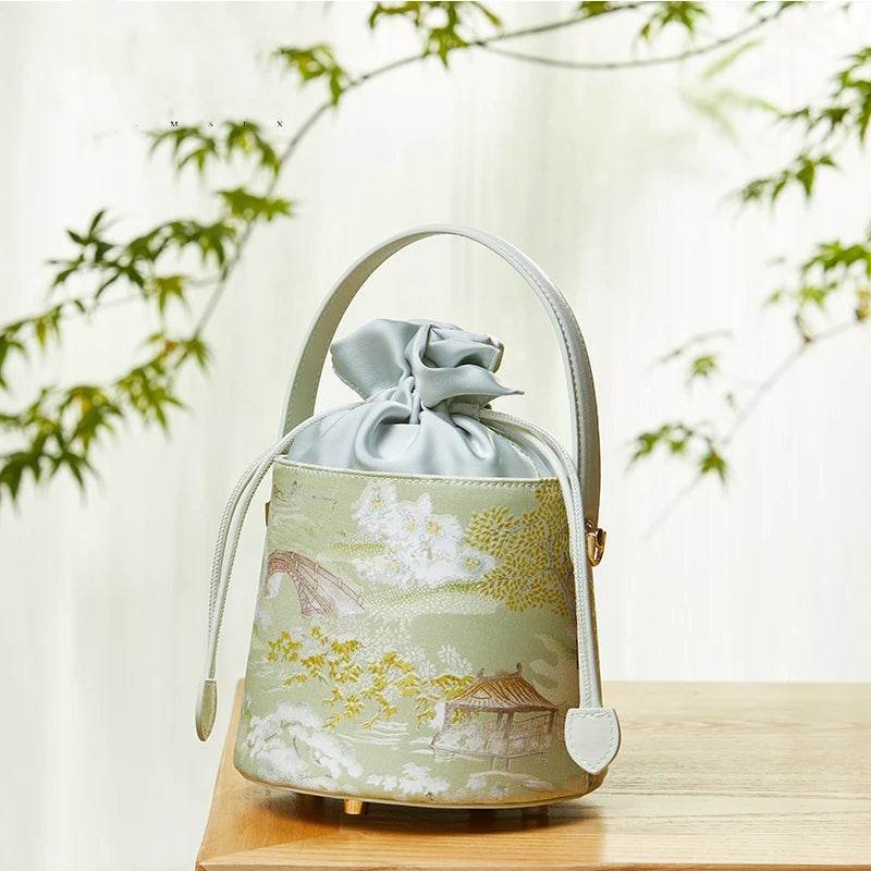 Be the first to review “Chinese Painting Mulberry Silk Green Bucket Designer Handbag”