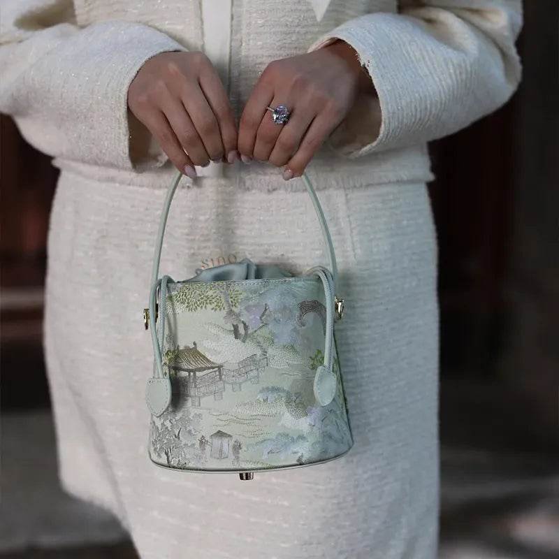 Chinese Painting Mulberry Silk Green Bucket Designer Handbag