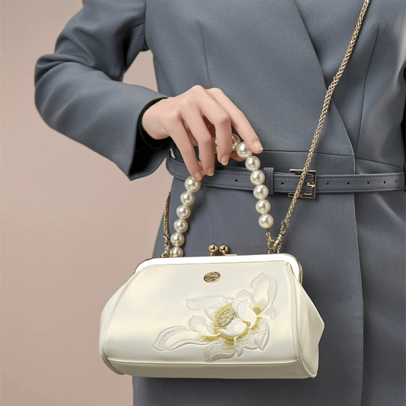 Embroidery Leather Kiss Lock Clutch Bag Lotus Evening Handbag
