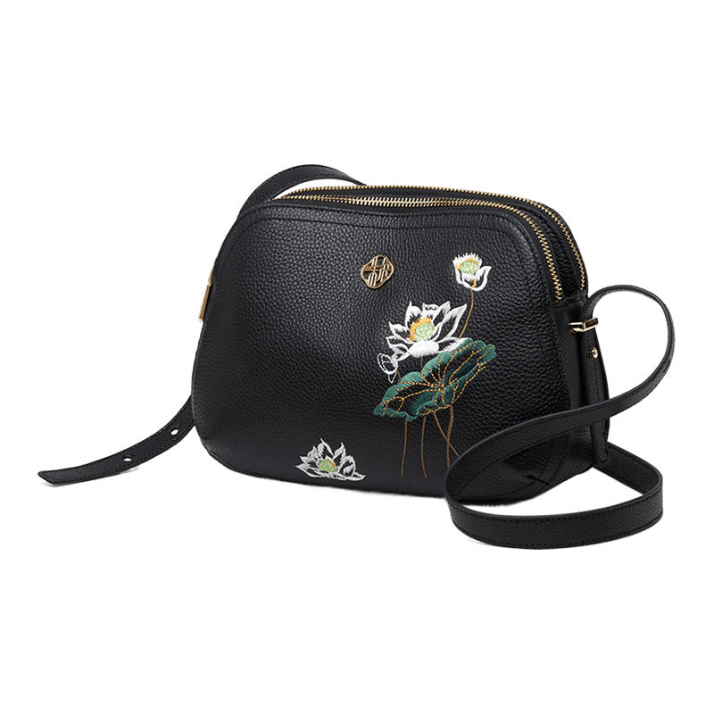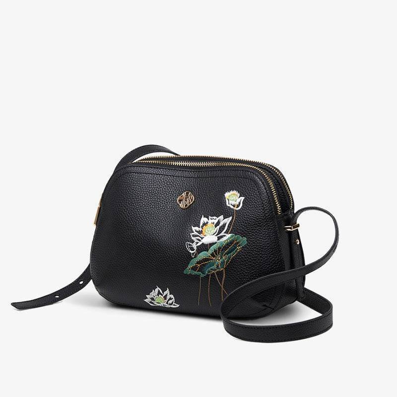 Embroidery Leather Shoulder Bag Black Lotus Handbag