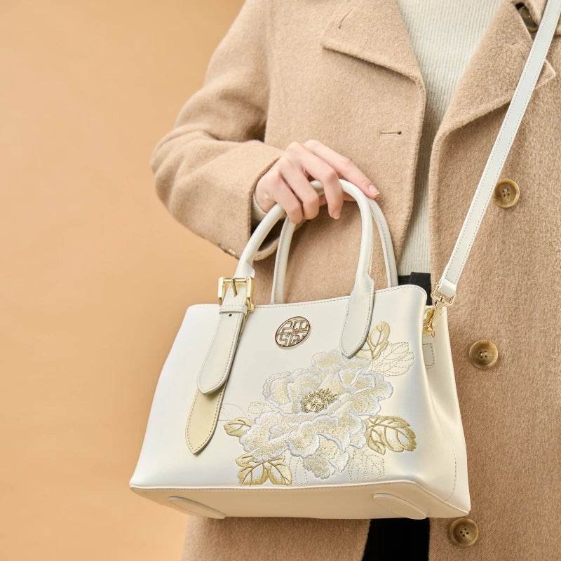 Embroidery Leather Tote Bag White Blooming Peony