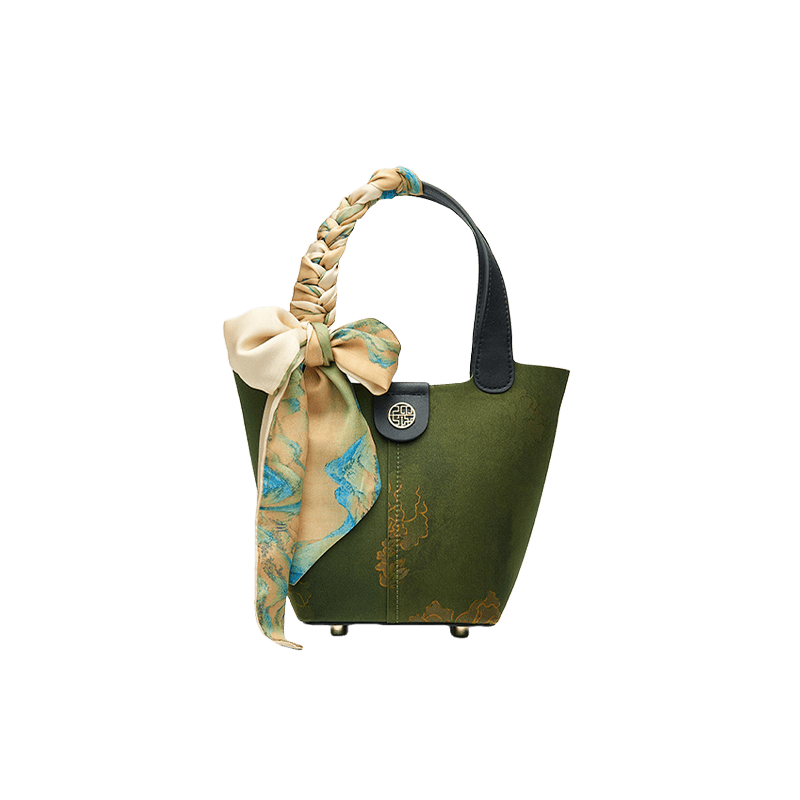 Xiangyunsha Silk Dark Green Bucket Bag with Scarf